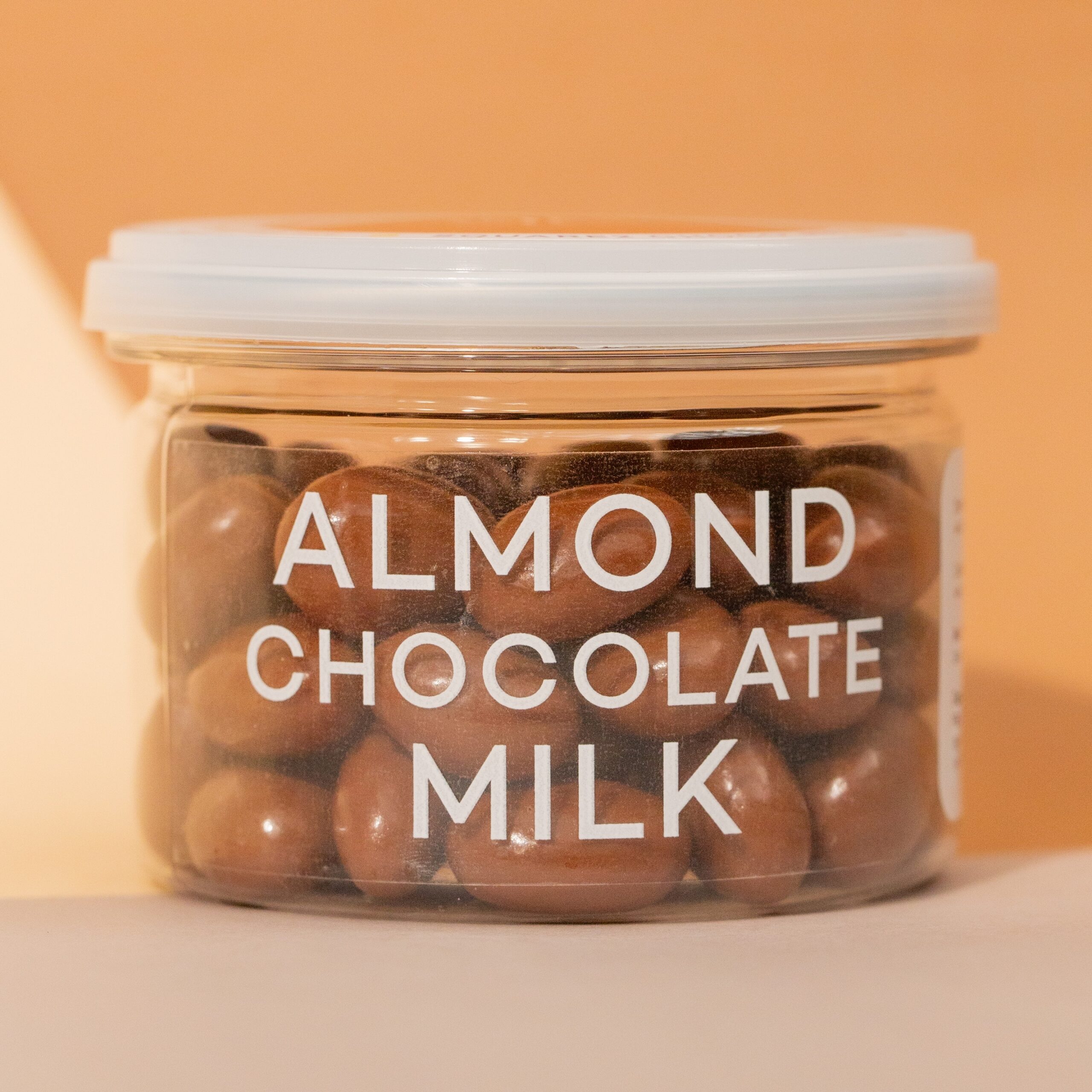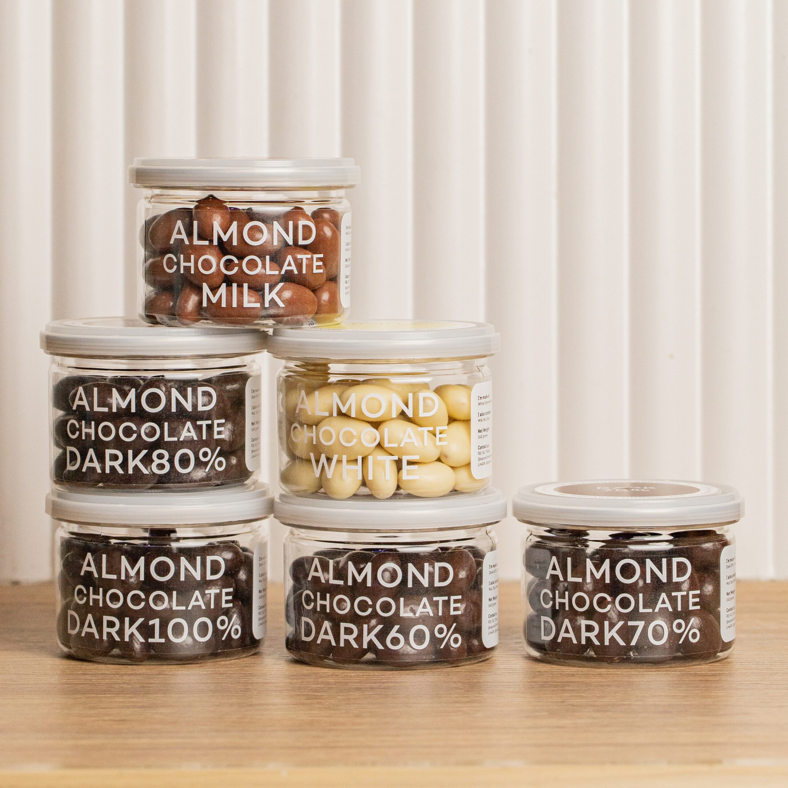 อัลมอนด์แท้เต็มเมล็ด ผ่านการคัดโดยละเอียด อบให้หอมกรอบ และนำไปเข้าเครื่องเคลือบช็อกโกแลตจนทั่วกันอย่างสมบูรณ์ มี 6 ระดับความเข้มข้นให้เลือก ตั้งแต่ ระดับที่หวานมัน หอมกลิ่น White Chocolate, หวานหอมนมๆอย่าง Milk Chocolate, เข้มไม่ขม ทานง่ายแบบ Dark60%, ดาร์กช็อกที่เริ่มเข้มข้นขึ้นอย่าง Dark70%, Dark80%รสชาติขมและหวานน้อย ไปจนถึง Dark100% เข้มสุดๆไม่หวานเลย